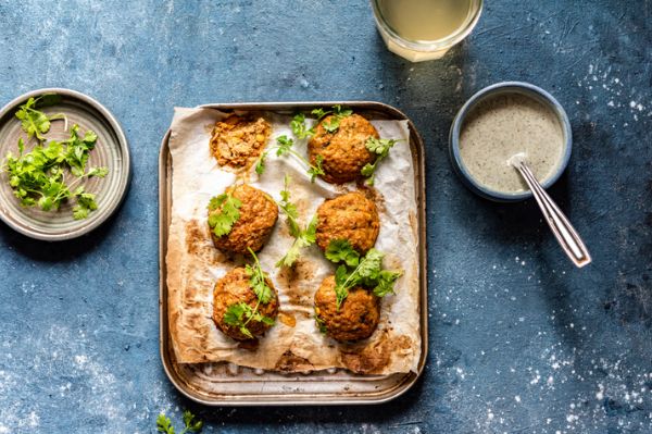 Für die Zubereitung der Soße wird Tahini, Joghurt, die gehackte Knoblauchzehe, Zitronensaft, Olivenöl und die gehackte Petersilie verrührt und mit Salz und Pfeffer abgeschmeckt.